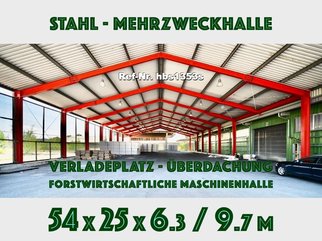 Diese Hallenkonstruktion könnte in ihrem zweiten Lebenszyklus für vielseitige Zwecke genutzt werden, z.B. als Fuhrparkhalle, land- oder forstwirtschaftliche Bergehalle, Geräte- oder Maschinenhalle, Lagerhalle, Offenstallung, offene Reithalle, Reitplatz-Überdachung, Sortier- und Recyclinghalle oder Wetterschutzhalle. ABMESSUNGEN gemäß Übersichtszeichnung, datiert 15.03.2010: Hallenbreite: ca. 25,00 m Außenkante Stahlrahmen; Hallen-Länge: ca. 54,17 m Mitte-Mitte Endrahmen; Längs-Raster: ca. 6,00 m x7 Regelabstand MM Stützen; ca. 12,00 m x1 in A, 8-9 und B, 8-9; Traufen-Höhe: ca. 6,35 m Traufkante ab OK FFB; First - Höhe: ca. 9,70 m OK Firstblech ab OK FFB; Dach-Neigung: ca. 15 Grad symmetrisches Satteldach; Schneelast: sk = 0.85 kN/m2, Schneelastzone 2*; Windlast: qb = 0.39 kN/m2, Windzone 2. BEMERKUNG: Um die Durchfahrt für Gabelstapler mit Langgut zu ermöglichen, wurden die Rahmenstützen in den "Achsen A, 8-9 und Achsen B, 8-9 sowie Achsen B, 3" durch drei Portalrahmen mit einer Breite von jeweils 12 Metern ersetzt. TRAGWERK: Die tragende Stahlkonstruktion der Überdachung besteht aus neun Stück frei gespannten Vollwand-Gebinden (Binderabstand 7x 6,00 m) und drei Stk. Portalrahmen (3x 12,00 m Felder) die aus Walzprofilen gefertigt, grundiert und in Farbe rot - RAL 3000 lackiert wurden. Die Längsaussteifung erfolgt durch Wandverbände und Dachverbände (in den Achsen A, 2-3 sowie in den Achsen A, 5-6 und in den Achsen B, 5-6). Zusätzlich erfolgt die Aussteifung der Dachebene durch Druckrohre und weitere Diagonalen in den Achsen A, 8-9 sowie in den Achsen B, 2-4 und B, 8-9 oberhalb der Portalrahmen. Dadurch wird eine noch höhere Stabilität und Belastbarkeit des Bauwerks erreicht. Die Rahmenstützen sind auf Einzelfundamente aufgeschraubt. Die Dachpfetten bestehen aus bandverzinkten und kaltgeformten Stahlleichtbau Z-Profilen. DACH: Das Dach besteht aus Trapezprofilblechplatten, die auf Stahlleichtbau-Dachpfetten befestigt sind. Die Trapezprofilblechdeckung besteht aus polyesterbeschichteten Stahlblechplatten (Farbe lichtgrau - RAL 7035) mit einer Antikondensat- Vliesunterseitenbeschichtung. Die Dachpfetten bestehen aus bandverzinkten kaltgeformten Z-Profilen. WAND: Die Wandverkleidung besteht lediglich aus einem Windschutznetz auf der langen Wetterseite in Achse A, 1-8, ansonsten ist keine weitere Wandverkleidung vorhanden. TRANSPORTVOLUMEN: Die Hallenkonstruktion wurde ursprünglich als Stahlbausatz geliefert und kann wieder in ihre Einzelkomponenten demontiert werden, um auf (etwa 3 bis 4) Sattelzügen transportiert zu werden. Die längsten Teile sind vermutlich die Portalrahmen-Traversen sowie die Dachpfetten. Weitere Informationen auf schriftliche Anfrage mit vollständigen Kontakt-/ Firmendaten.